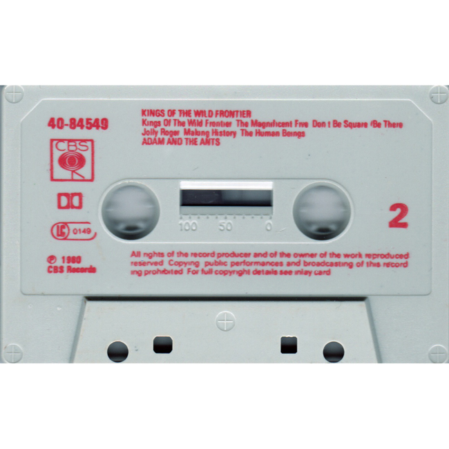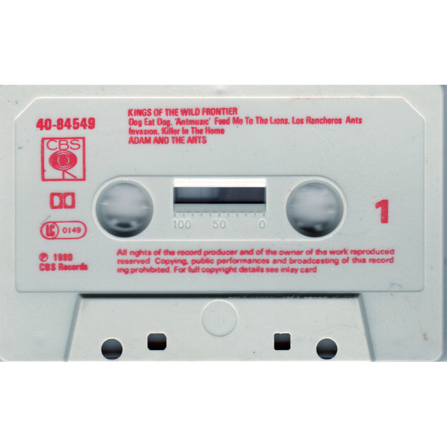 Adam Ant Recorded at Rockfield Studio in Monmouth, Wales in August 1980, this new 5 piece band were to produce one of the most iconic albums of the 80s The front and back cover of the album are photographs taken from the monitor during the filming of the Kings of the Wild Frontier video in early August 1980 There are at least four versions of the UK cassette, one with red text on the cassette (this one pictured here), another where the text is in black (there are two different inlay sleeves) and one with paper labels. |