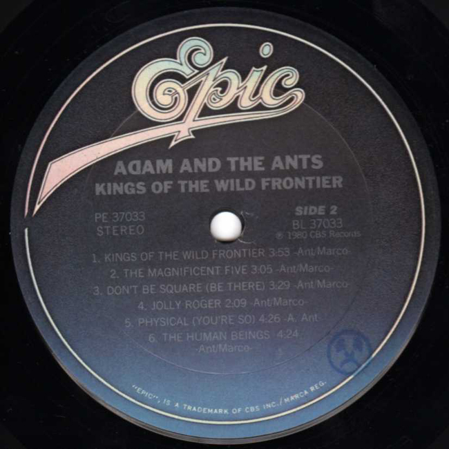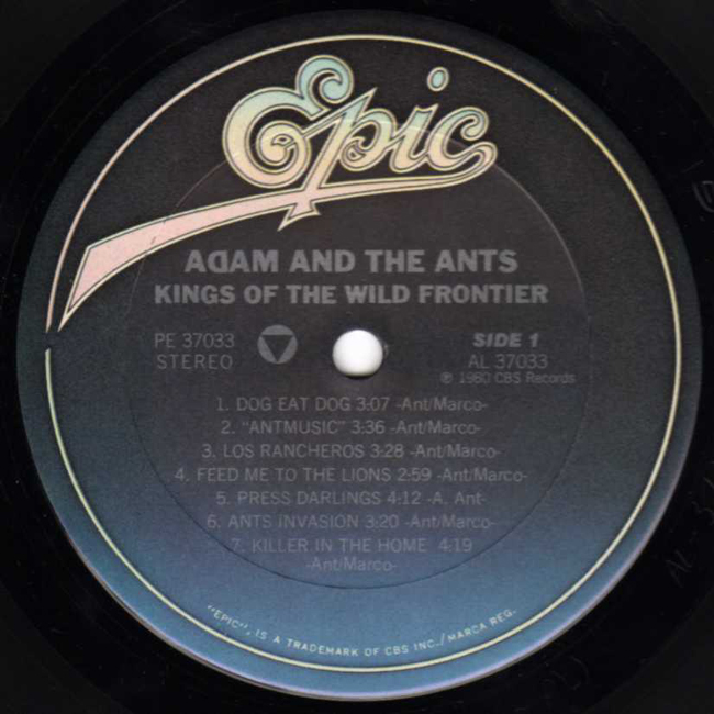 Adam Ant Recorded at Rockfield Studio in Monmouth, Wales in August 1980, this new 5 piece band were to produce one of the most iconic albums of the 80s The front and back cover of this album are photographs taken from the monitor during the filming of the Kings of the Wild Frontier video in early August 1980 The US version of the album changes the running order of the tracks on side 1 by swapping Feed me the the Lions and Los Rancheros around and then adding the song Press Darlings which was originally the B-Side to the UK release of the single Kings of the Wild Frontier. This version has the catalogue number PE 37033 rather than the usual NJE 37033. |