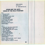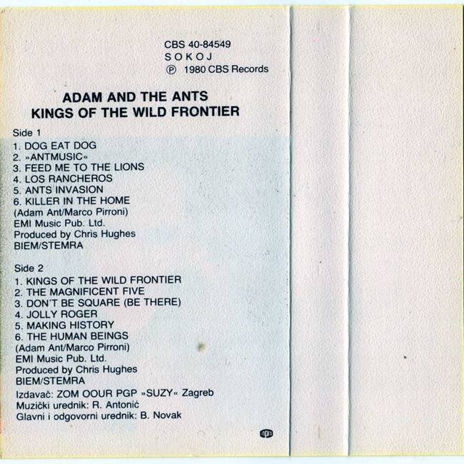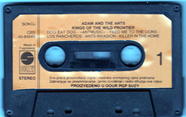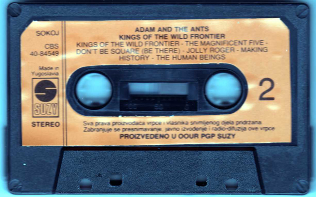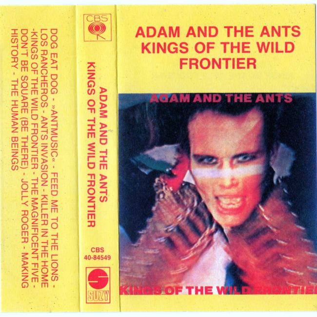 Adam Ant Recorded at Rockfield Studio in Monmouth, Wales in August 1980, this new 5 piece band were to produce one of the most iconic albums of the 80s The front cover of this cassette album is a photograph taken from the monitor during the filming of the Kings of the Wild Frontier video in early August 1980 CBS releases were licenced through SUZY in Yugoslavia. |