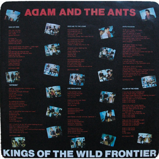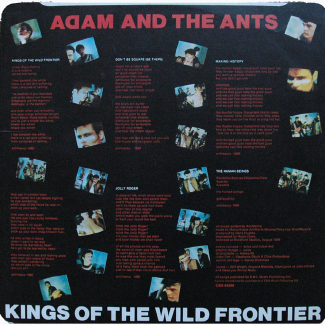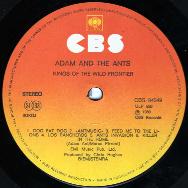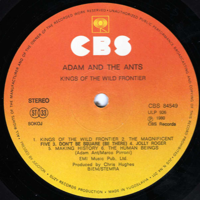 Adam Ant Recorded at Rockfield Studio in Monmouth, Wales in August 1980, this new 5 piece band were to produce one of the most iconic albums of the 80s The front and back cover of this album are photographs taken from the monitor during the filming of the Kings of the Wild Frontier video in early August 1980 CBS releases were licenced through SUZY in Yugoslavia. There are at least three versions of the Yugoslavian Kings album, each with a slightly different font on the label as featured below: |