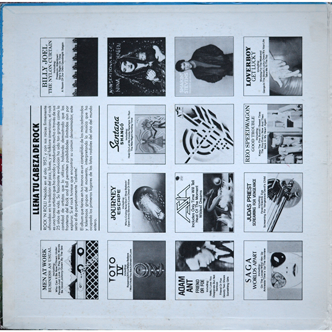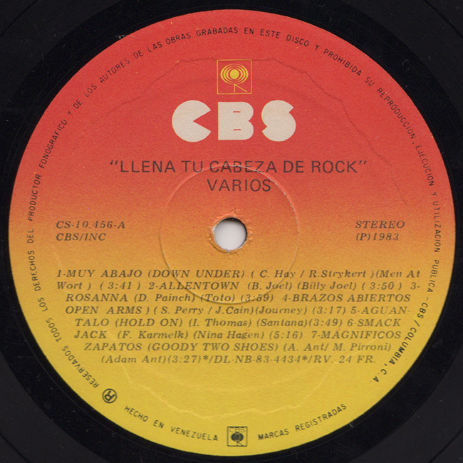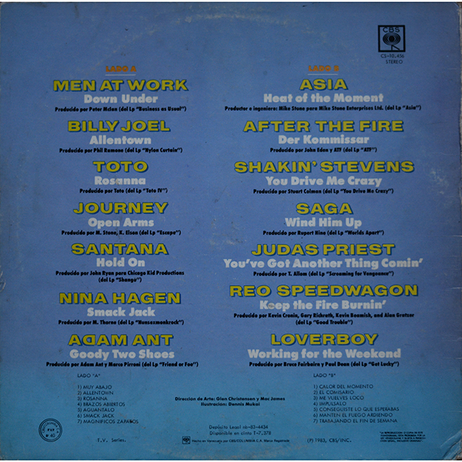Side 1 Men at Work - Down Under (Muy Abajo) Billy Joel - Allentown (Allentown) Toto - Rosanna (Rosanna) Journey - Open Arms (Brazos Abiertos) Santana - Hold on (Aguantalo) Nina Hagen - Smack Jack (Smack Jack) Adam Ant - Goody Two Shoes (Magnificos Zapatos)