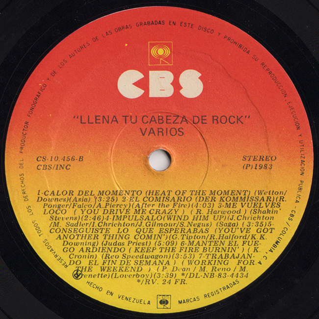 Side 2 Asia - Heat of the Moment (Calor Del Momento) After the Fire - Der kommissar (El Comisario) Shakin' Stevens - You Drive me Crazy (Me Vuelves Loco) Saga - Wind him up (Impulsalo) Judas Priest - You've got another thing comin' (Conseguiste Lo Que Esperabas) REO Speedwagon - Keep the Fire Burnin' (Manten el Fuego Ardiendo) Loverboy - Working for the Weekend (Trabajando Para el Fin de Semana)