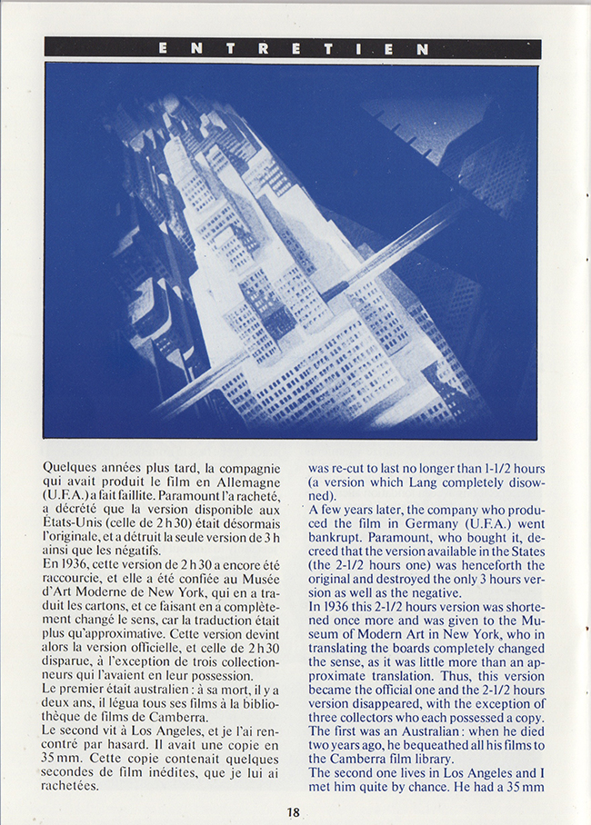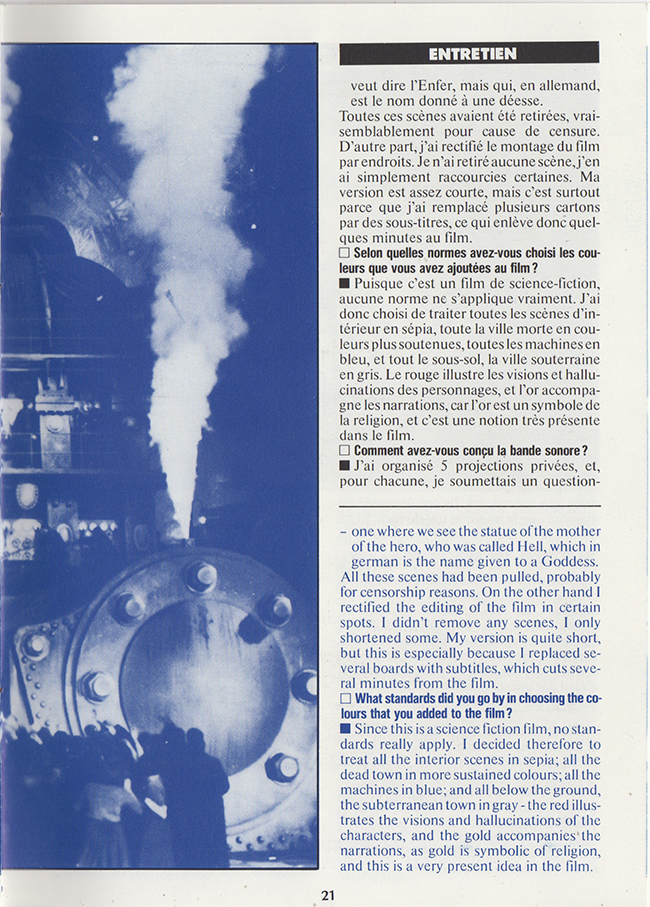 This 1984 reworking of the 1927 Fritz Lang classic film was by Giorgio Moroder with a modern soundtrack. The film was tinted throughout with added subtitles rather than the original intertitles