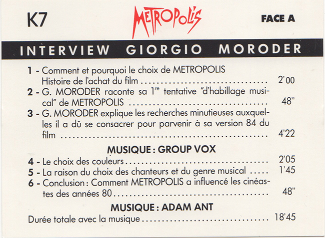 Side 1 1. How and why for the choice of METROPOLIS and the story of the purchase of the film 2. G. Moroder tells of his 1st muscial attempt of METROPOLIS 3. G.Moroder explains the meticulous research he had to devote to his 1984 version of the film 4. The choice of colours 5. The reason for the choice of singers and the musical genre 6. Conclusion: How METROPOLIS influenced filmmakers of the 80's Adam Ant - What's Going on? Excerpt