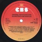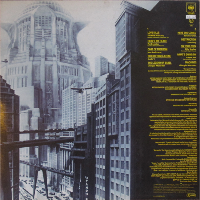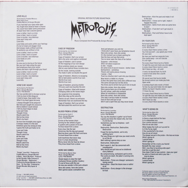 Adam Ant Country Label Catalogue Number Matrix numbers Format Release date Side 1 Side 2 Adam Ant features on one track "What's Going on?" on the film sountrack for Metropolis This 1984 reworking of the 1927 Fritz Lang classic film was by Giorgio Moroder with a modern soundtrack. The Netherlands release came with a different sleeve to all other releases and also came in a standard sleeve rather than a gatefold. |
