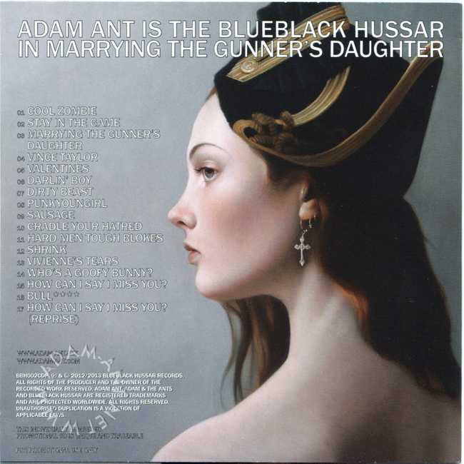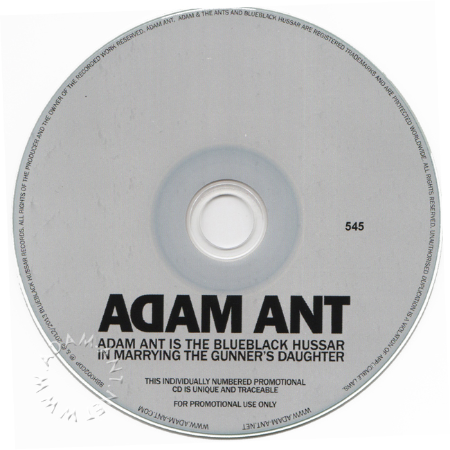 Adam Ant Country Label Catalogue Number Matrix numbers Format Release date Tracks Numbered Promotional CD in card sleeve of released on Adam's own label Blueblack Hussar Records 1000 copies of the promo were produced |