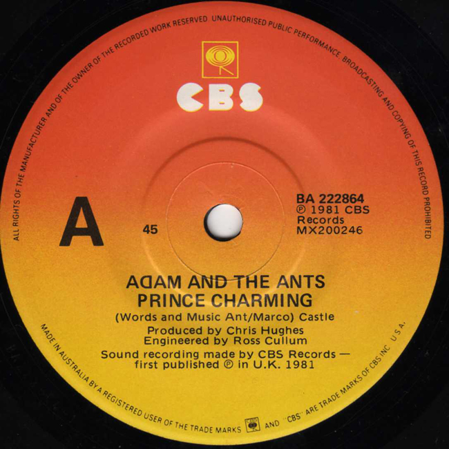 Adam and the Ants Country Label Catalogue Number Matrix numbers Format Release date A-side B-side The second single to be released from the Prince Charming album and the band's second number one single. The B-side, Christian D'or, is an old Ants song from 1978. |