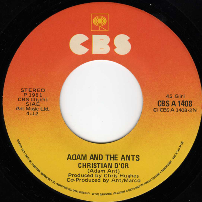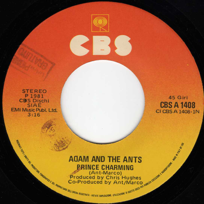 Adam and the Ants Country Label Catalogue Number Matrix numbers Format Release date A-side B-side The second single to be released from the Prince Charming album and the band's second number one single. The B-side, Christian D'or, is an old Ants song from 1978. The Italian front sleeve has the same image on the back as it does on the front. |