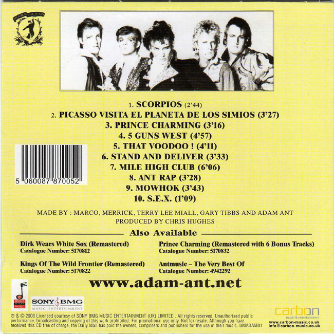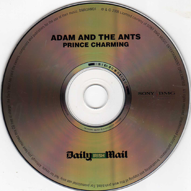 Adam Ant Promotional offer in conjunction with the Daily Mail newspaper in the Ireland where the original version of the Prince Charming album was given away as part of a two week offer for Classic 80s CDs The Irish version differs from the UK version on the disc and front cover with the addition of the word IRISH inserted between the words Daily and Mail. The tracklisting for the CD is incorrect as Mile High Club and Antrap play as one song (hence the 6'06 running time). Whilst playing the CD through Windows Media, Mile High Club is credited as a Dave Barbarossa; Leigh Gorman; Malcolm McLaren composition |