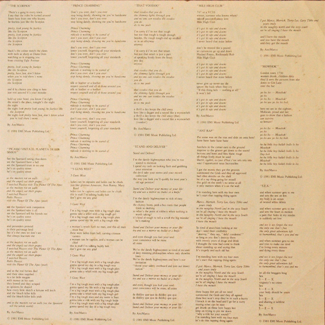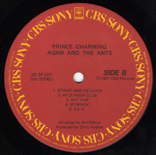Adam Ant The band's second album for CBS was released, almost to the day, one year after their first. All of the tracks were written in 1981, apart from Picasso (1979) and S.E.X. (1980). The Hong Kong version has the same catalogue number as the Japanese release, plus the same details written in English and Japanese on the back sleeve with the addition of the tracks which are listed. |