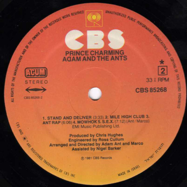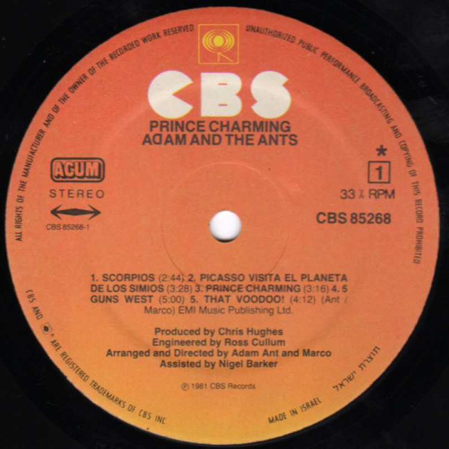 Adam Ant The band's second album for CBS was released, almost to the day, one year after their first. All of the tracks were written in 1981, apart from Picasso (1979) and S.E.X. (1980). The Israeli front cover has the band's name in red and yellow instead of red and gold as with all other releases worldwide. |