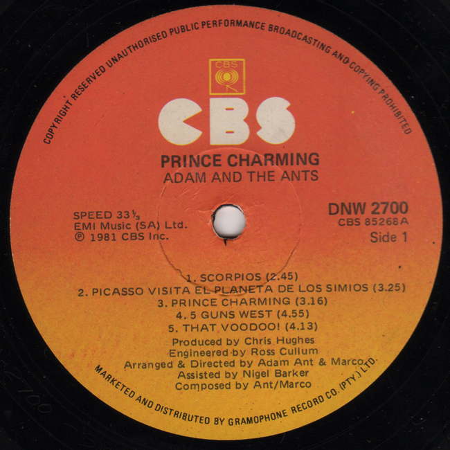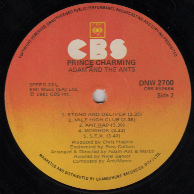 Adam Ant The band's second album for CBS was released, almost to the day, one year after their first. All of the tracks were written in 1981, apart from Picasso (1979) and S.E.X. (1980). The South African catalogue numbers all have the prefix DNW rather than CBS