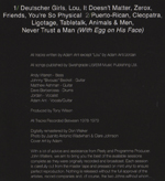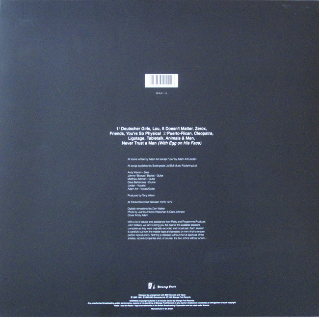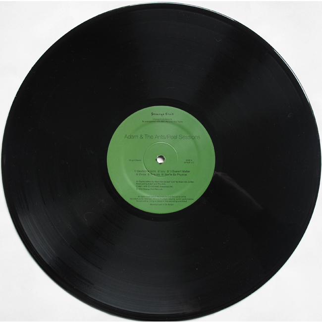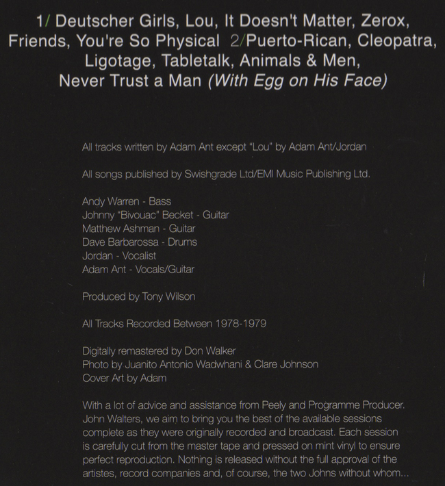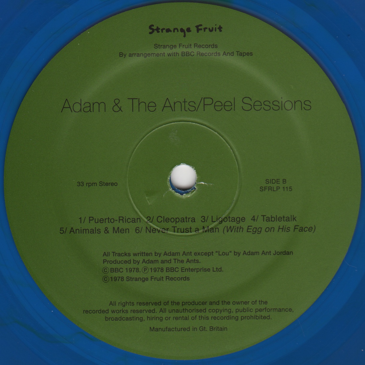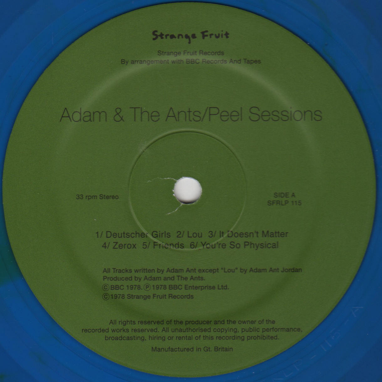 Adam and the Ants Country Label Catalogue Number Matrix numbers Format Release date Side 1 Side 2 adam-ant.net does not condone or encourage unofficial releases. Deutscher Girls/Puerto Rican/Lou/It Doesn't Matter - Recorded at Maida Vale studio 23rd January 1978 Puerto Rican & Deutscher Girls which were missing from the original Peel sessions album on Strange Fruit have been added to this bootleg, one on either side of the record. It is not known how many copies have been pressed for this bootleg, but there are also copies in black and green. The bootleg is easily identified from the front cover as the slash between Adam and the Ants and Peel Sessions is in green, whereas the official release had the slash in red. The text on the back of the sleeve omits the exact session details and only states - |