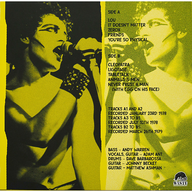 Adam and the Ants Country Label Catalogue Number Matrix numbers Format Release date Side 1 Side 2 adam-ant.net does not condone or encourage unofficial releases. Lou/It Doesn't Matter - Recorded at Maida Vale studio 23rd January 1978 and were for the 1st Radio 1 Peel session Puerto Rican & Deutscher Girls which were missing from the original Peel sessions album on Strange Fruit are still missing for this bootleg. It is not known how many copies have been pressed for this bootleg. Johnny Bivouac is credited under his real name John Beckett, although with incorrect spelling. |