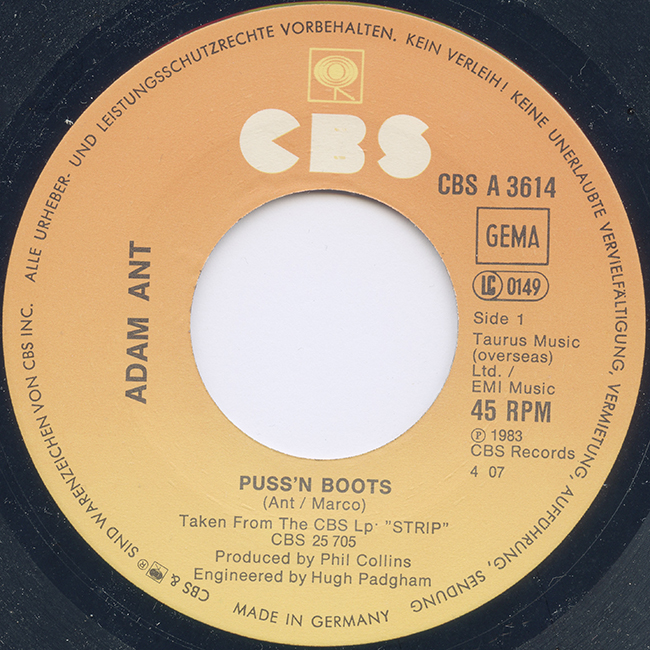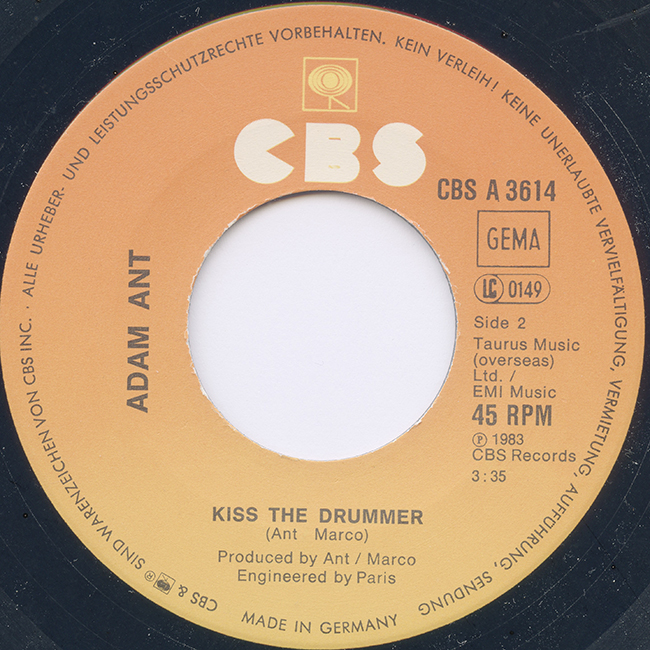 Adam Ant Country Label Catalogue Number Matrix numbers Format Release date A-side B-side The B-side, Kiss the Drummer, is a new song, the first B-side to be written by Ant/Marco. Although released in Germany, the sleeve is the same as the Netherlands and states Made in Holland |
