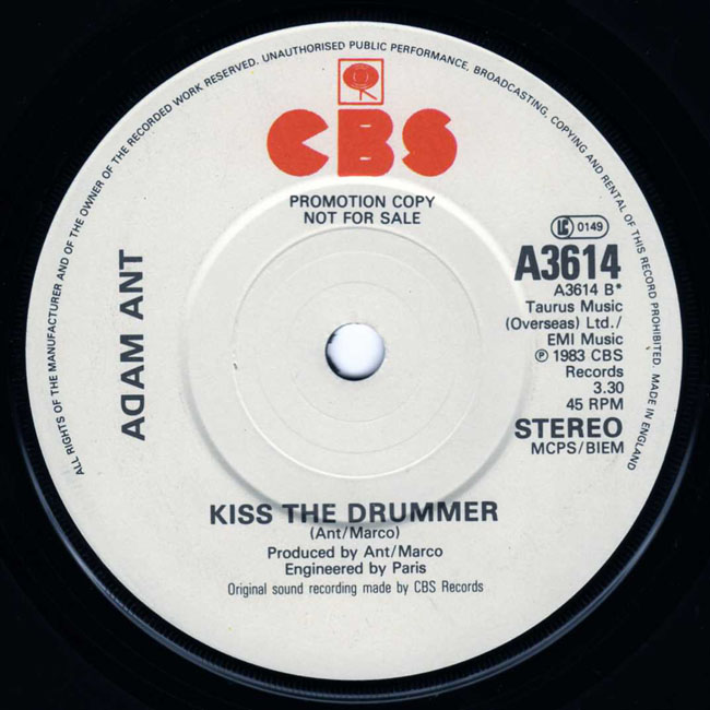 Adam Ant Country Label Catalogue Number Matrix numbers Format Release date A-side B-side Promotional single The B-side, Kiss the Drummer, is a new song, the first B-side to be written by Ant/Marco. |