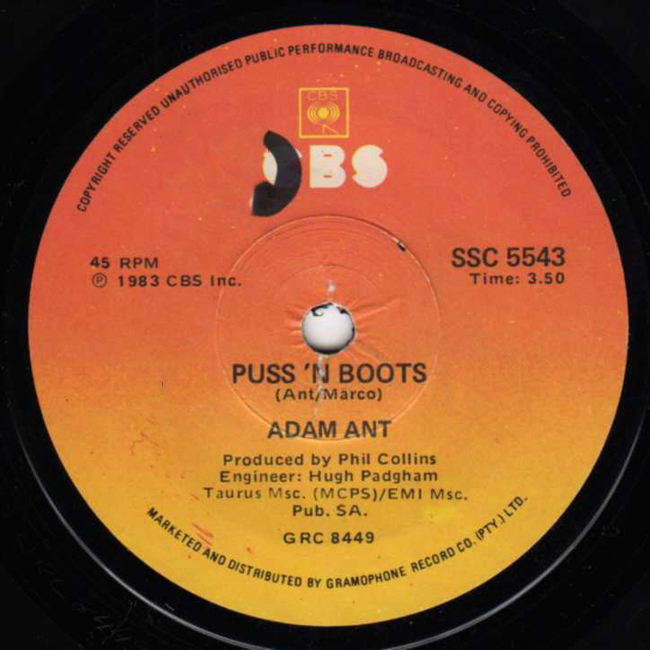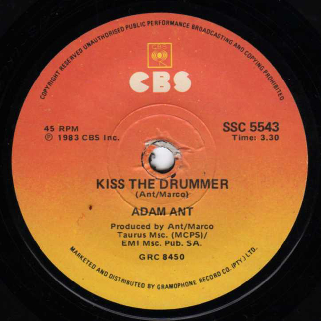 Adam Ant Country Label Catalogue Number Matrix numbers Format Release date A-side B-side South African release in a standard CBS company sleeve The B-side, Kiss the Drummer, is a new song, the first B-side to be written and released by Ant/Marco. |
