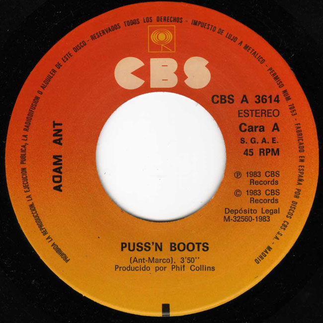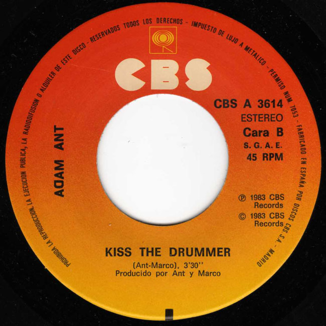 Adam Ant Country Label Catalogue Number Matrix numbers Format Release date A-side B-side The back cover of this single has the lyrics to Puss'n Boots and aso advertises the Strip album and the Spanish 12" version of Puss'n Boots. The B-side, Kiss the Drummer, is a new song, the first B-side to be written by Ant/Marco. |
