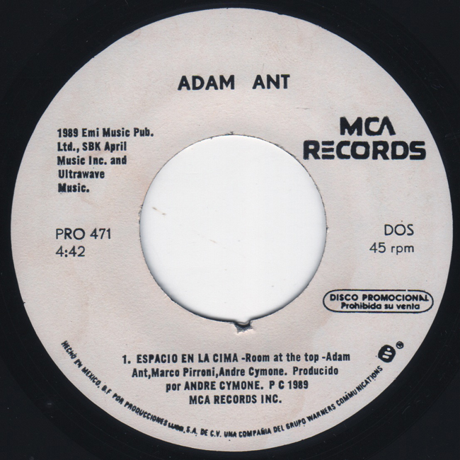 Adam Ant Country Label Catalogue Number Matrix numbers Format Release date A-side B-side Promotional white label Mexican 7" single with Room at the Top on both sides |