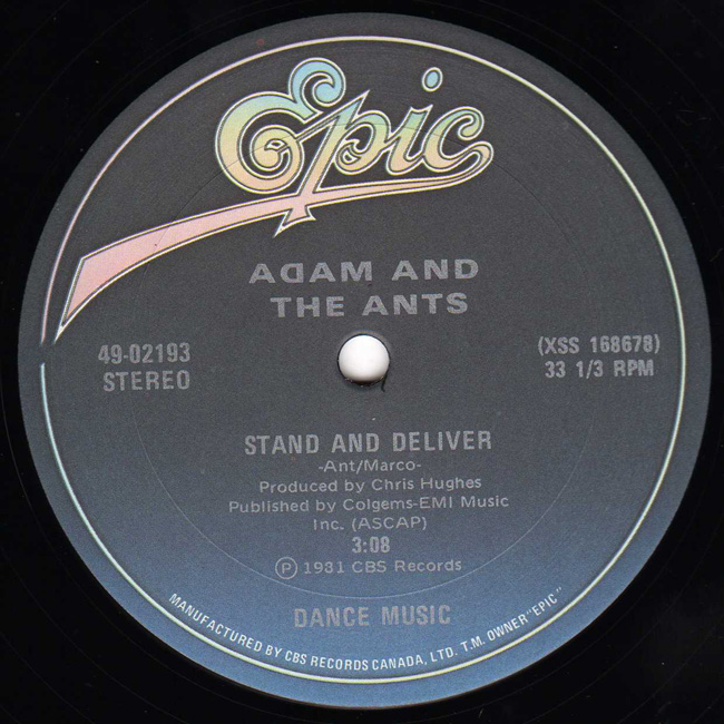 Adam and the Ants Country Label Catalogue Number Matrix numbers Format Release date A-side B-side 12" release from Canada. The font logo for Stand and Deliver differs from most of the other worldwide releases. It is much more plain (same as the US version). The labels conveniently categorise the songs as "Dance Music"! |