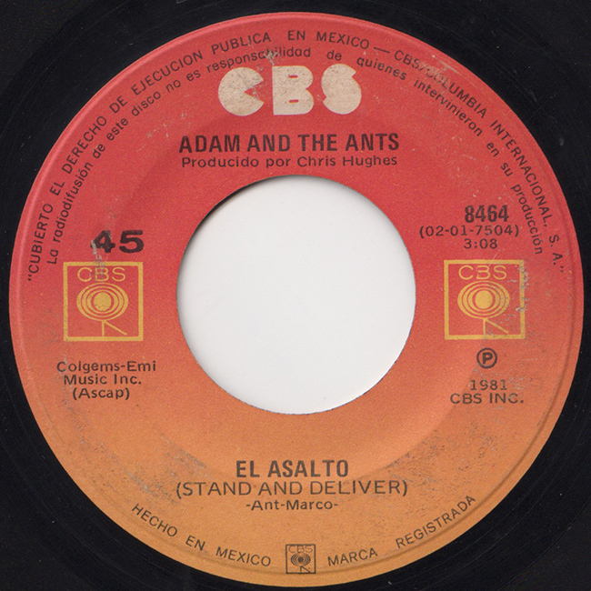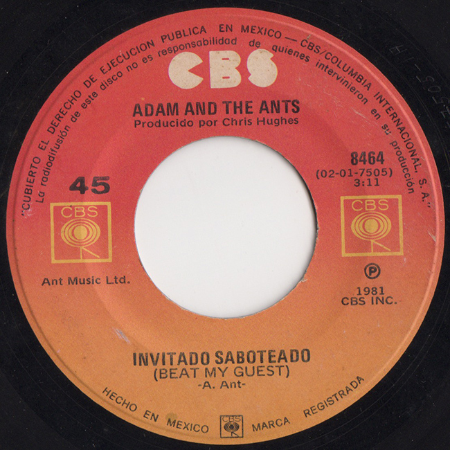 Adam and the Ants Country Label Catalogue Number Matrix numbers Format Release date A-side B-side Mexican release in a CBS company sleeve. |