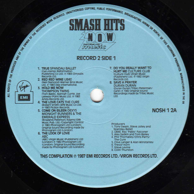 Side 3 Spandau Ballet - True UB40 - Red Red Wine Thompson Twins - Hold Me Now The Cure - The Love Cats Dexys Midnight Runners - Come on Eileen ABC - The Look of Love Culture Club - Do You Really Want To Hurt Me Duran Duran - Save a Prayer