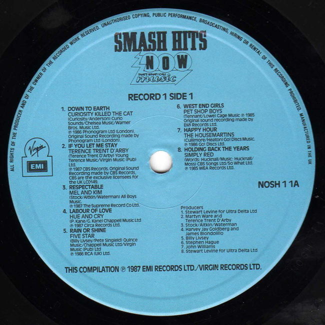 Side 1 Curiosity Killed the Cat - Down to Earth Terence Trent D'Arby - If You Let Me Stay Mel and Kim - Respectable Hue and Cry - Labour of Love Five Star - Rain or Shine Pet Shop Boys - West End Girls The Housemartins - Happy Hour Simply Red - Holding Back the Years