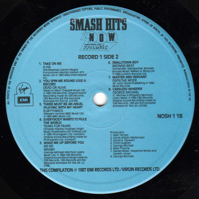 Side 2 A-Ha - Take on Me Dead or Alive - You Spin Me Round (Like a Record) Eurythmics - There Must Be An Angel (Playing With My Heart) Wham! - Wake Me Up Before You Go Go Bronski Beat - Smalltown Boy Depeche Mode - Master and Servant George Michael - Careless Whisper