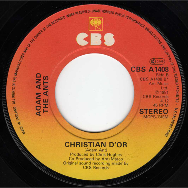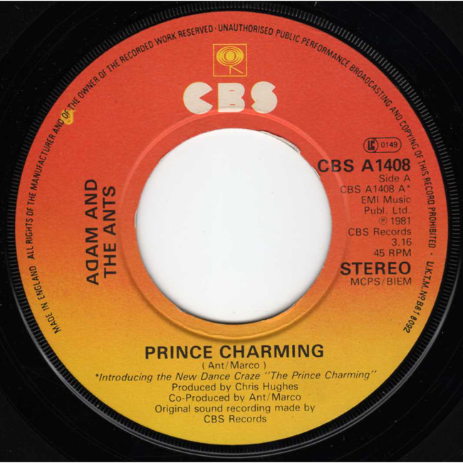 Adam and the Ants Country Label Catalogue Number Matrix numbers Format Release date A-side B-side The second single to be released from the Prince Charming album and the band's second number one single. The B-side, Christian D'or, is an old Ants song from 1978. The font on the label for the words Adam and the Ants is smaller than that of the main pressing. |