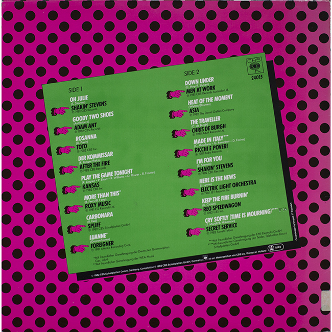 Side 2 Men At Work - Down Under Asia - Heat of the Moment Chris De Burgh - The Traveller Ricchi E Poveri - Made In Italy Shakin' Stevens - I'm For You Electric Light Orchestra - Here is the News REO Speedwagon - Keep The Fire Burnin' Secret Service - Cry Softly (Time is Mourning)