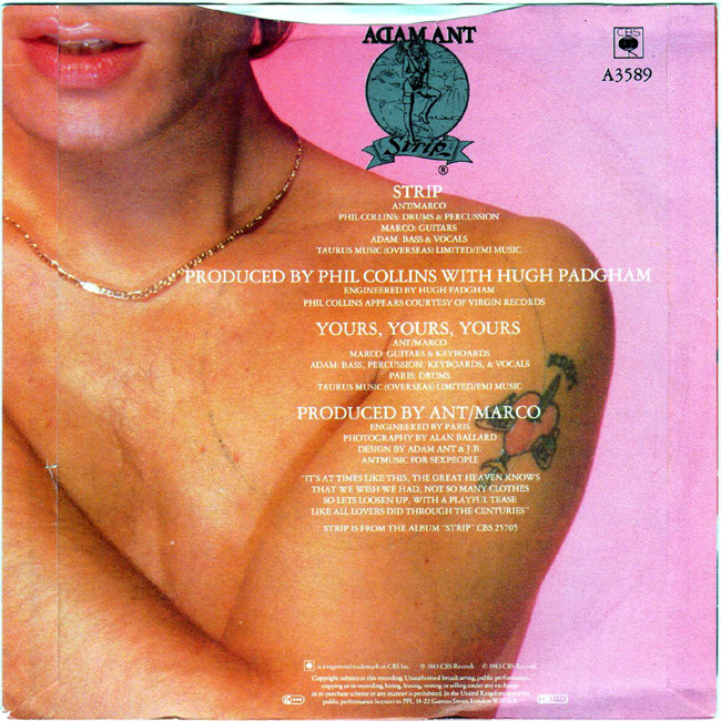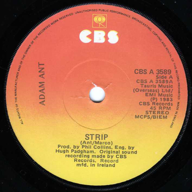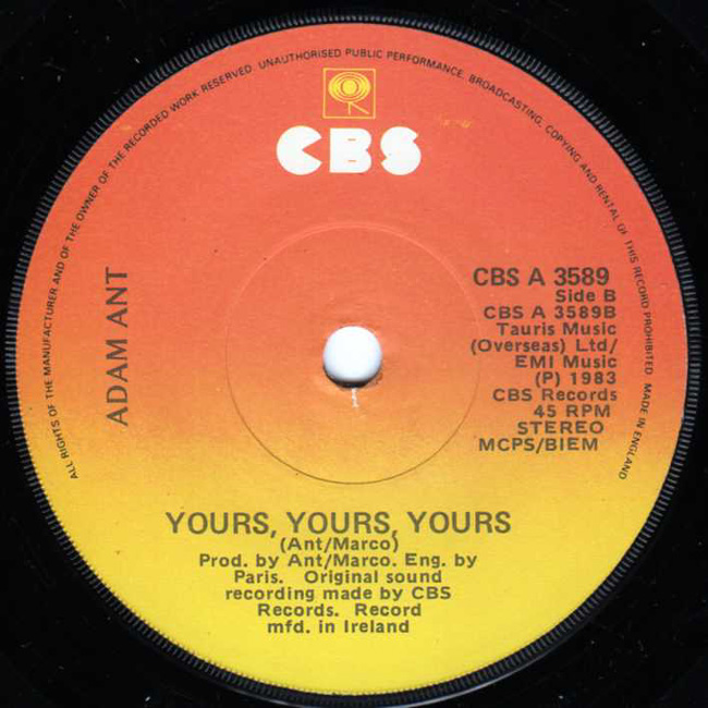 Adam Ant Country Label Catalogue Number Matrix numbers Format Release date A-side B-side The Irish release was issued in the same picture sleeve as the UK. |