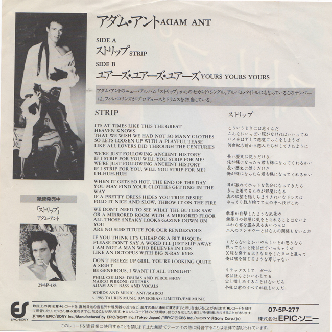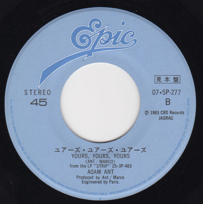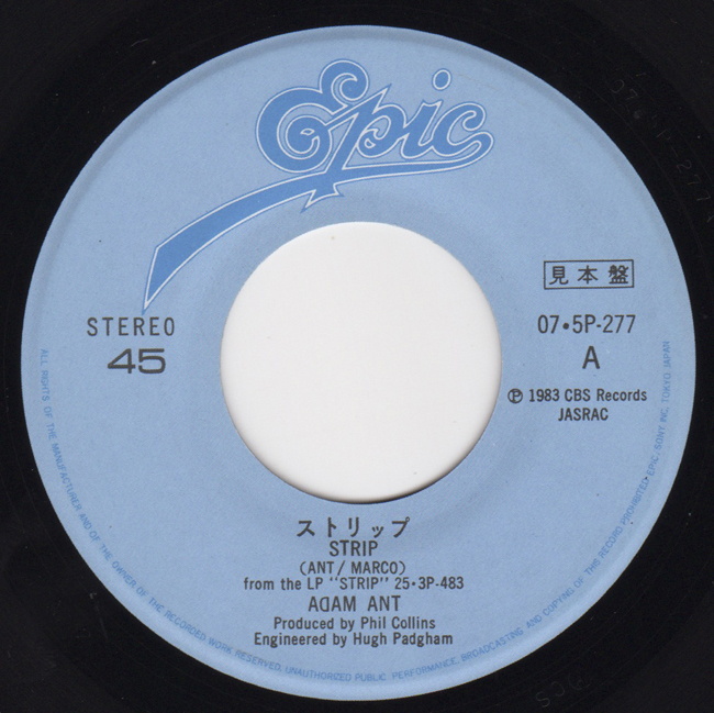 Adam Ant Country Label Catalogue Number Matrix numbers Format Release date A-side B-side The promo release of the Japanese single is identifiable by the promotional only text printed above the catalogue number, which translates as NOT FOR SALE |