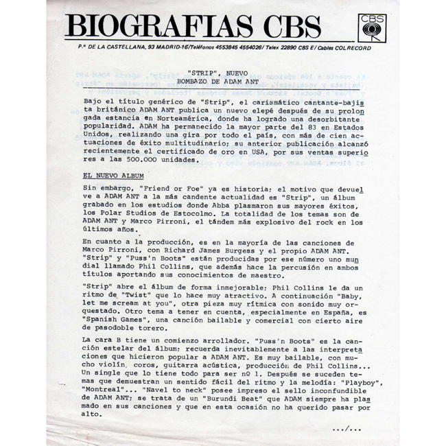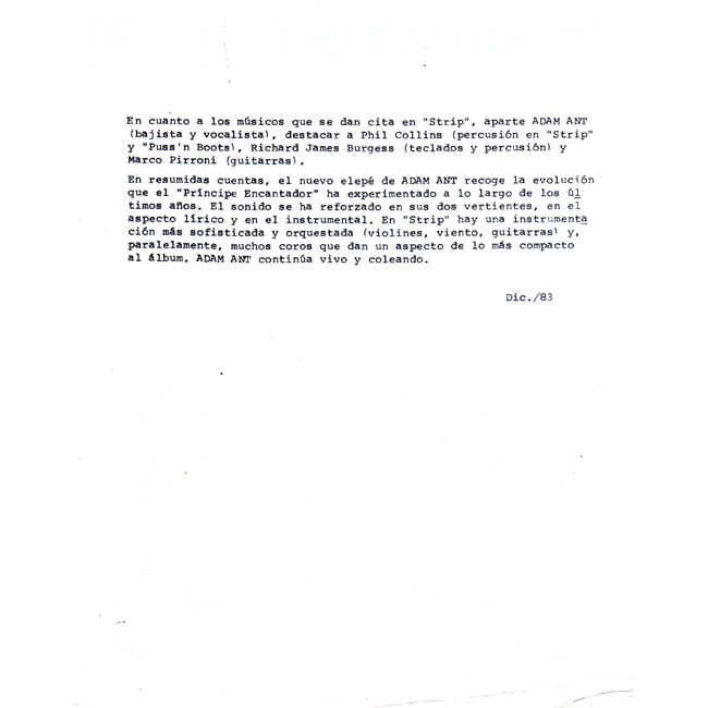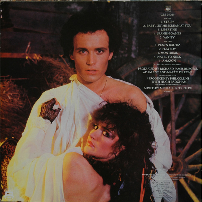 Adam Ant - Bass and vocals Recorded at Abba's Polar Studios, Stockholm, Sweden The cover photos were taken by Allan Ballard Phil Collins played drums on the title track and also Puss'n Boots All tracks were new compositions with the exception Libertine, the music for which was written and demoed in 1980 under the title Who's a Goofy Bunny then? and the music for Navel to Neck which was originally demoed in 1979 with the title Killer in the Home White label Spanish promo that came with a press release |