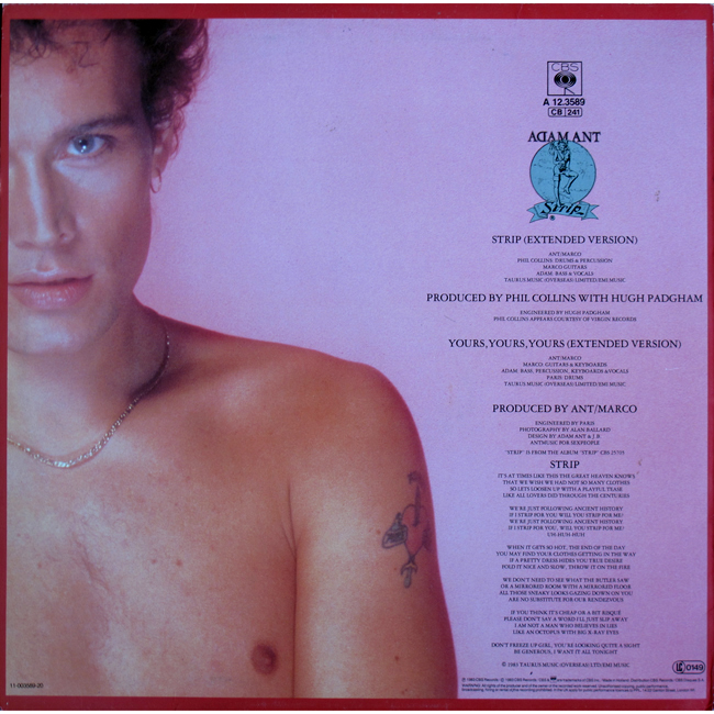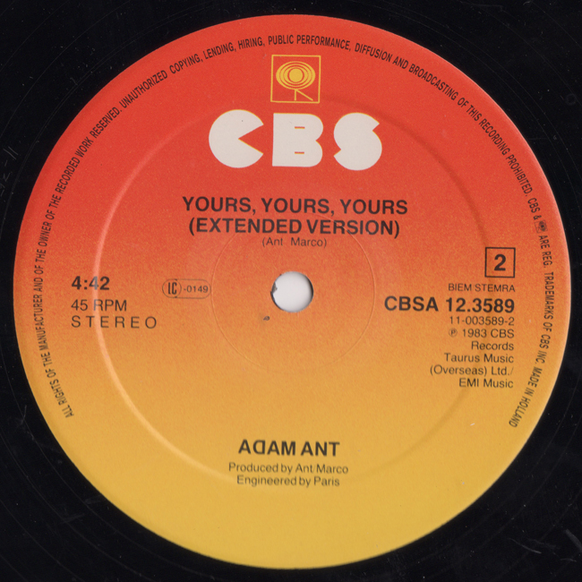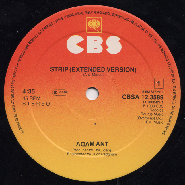 Adam Ant Country Label Catalogue Number Matrix numbers Format Release date A-side B-side The Netherlands "12" Maxi Single" version that featured extended versions of the 7" single for both sides. |