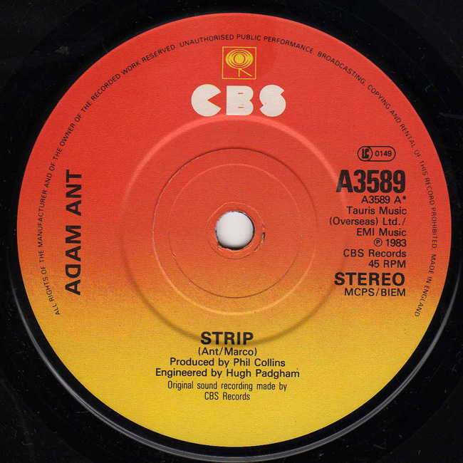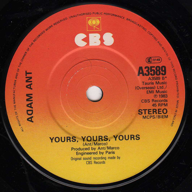 Adam Ant Country Label Catalogue Number Matrix numbers Format Release date A-side B-side Picture sleeve rather than the initial poster sleeve release. |