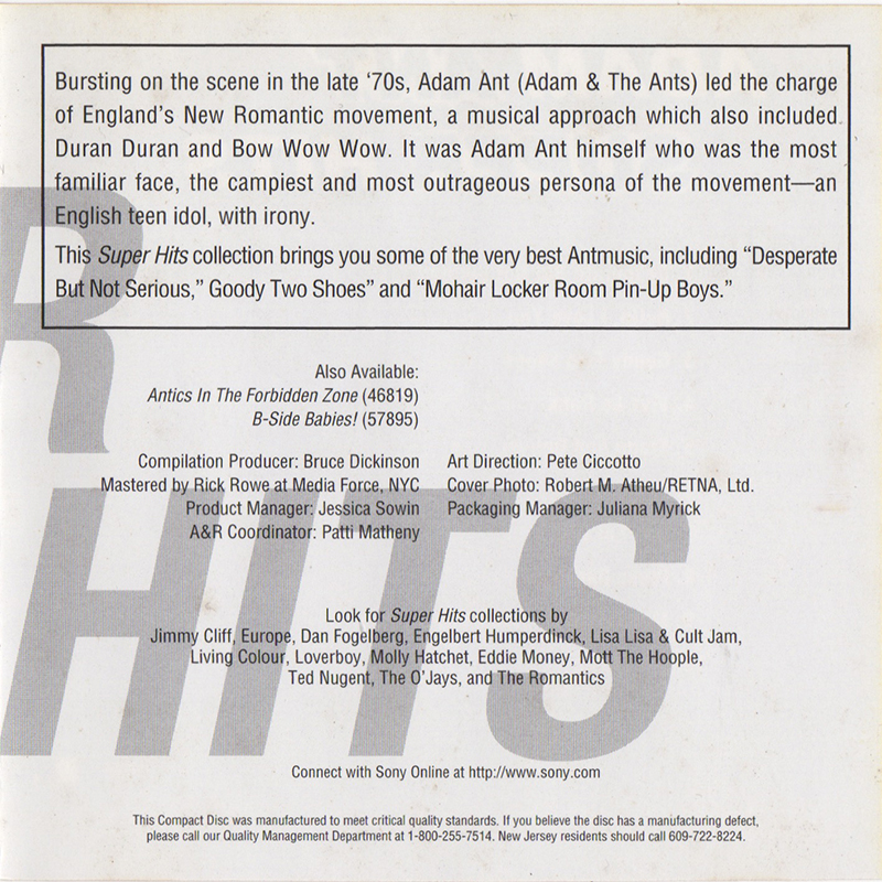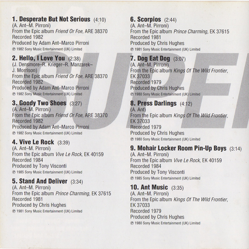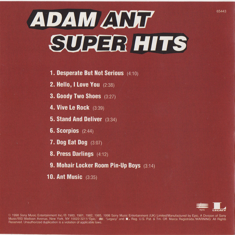 Adam Ant Country Label Catalogue Number Matrix numbers Format Release date Tracks 10 track CD including singles, B-sides and album tracks from Adam and the Ants and Adam Ant solo 1980 through to 1985. |
