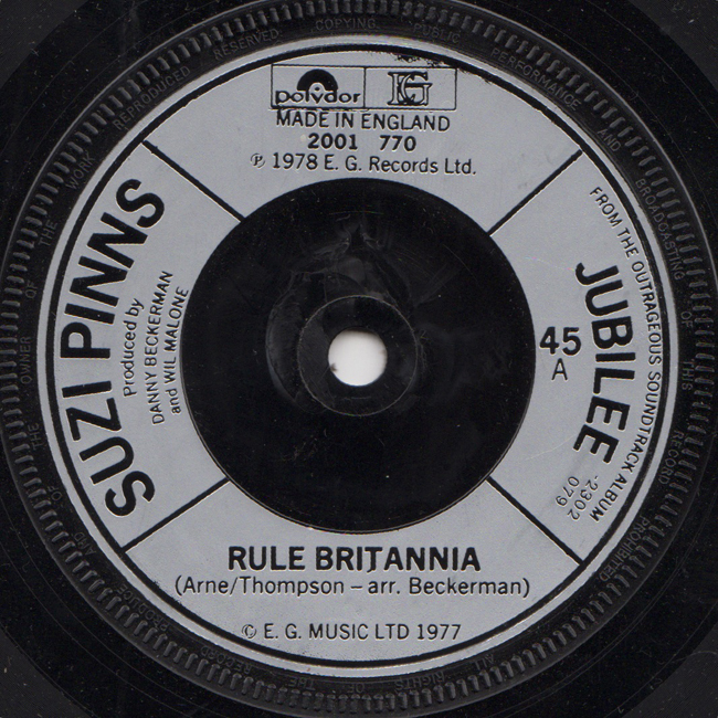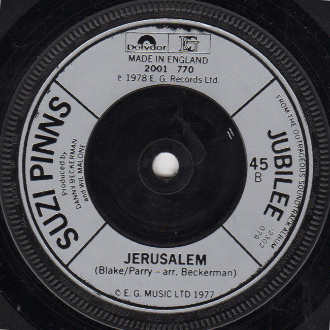 Suzi Pinns Country Label Catalogue Number Matrix numbers Format Release date A Side B Side The Suzi Pinns track Jerusalem was mimed by Jordan who played the character Amyl Nitrate in the film. EG Records licenced through Polydor |