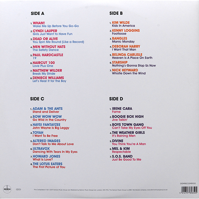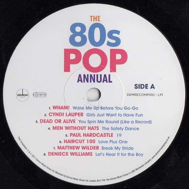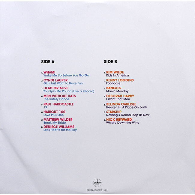 Side 1 Wham! - Wake Me Up Before You Go-Go Cyndi Lauper - Girls Just Want to Have Fun Dead or Alive - You Spin Me Round (Like A Record) Men Without Hats - The Safety Dance Paul Hardcastle - 19 Haircut 100 - Love Plus One Matthew Wilder - Break My Stride Deniece Williams - Let's Hear it for the Boy