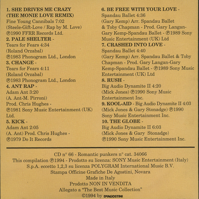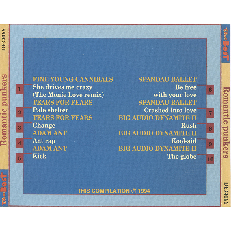 Fine Young Cannibals - She Drives Me Crazy (The Monie Love Remix) Tears For Fears - Pale Shelter Tears For Fears - Change Adam Ant - Ant Rap Adam Ant - Kick Spandau Ballet - Be Free With Your Love Spandau Ballet - Crashed Into Love Big Audio Dynamite II - Rush Big Audio Dynamite II - Kool-aid Big Audio Dynamite II - The Globe