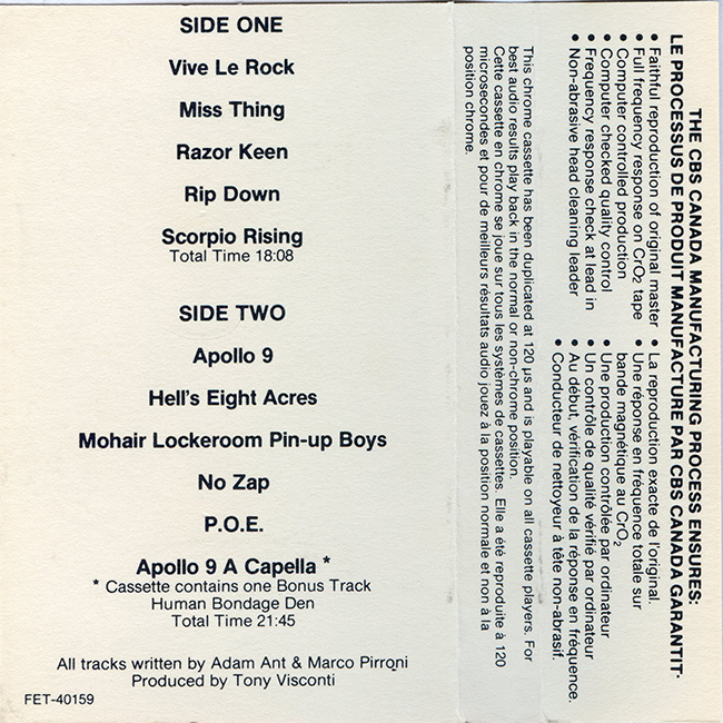 The Canadian cassette features the extra track Apollo 9 A Capella which was on all vinyl releases but wasn't credited.