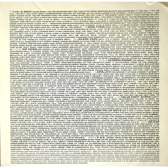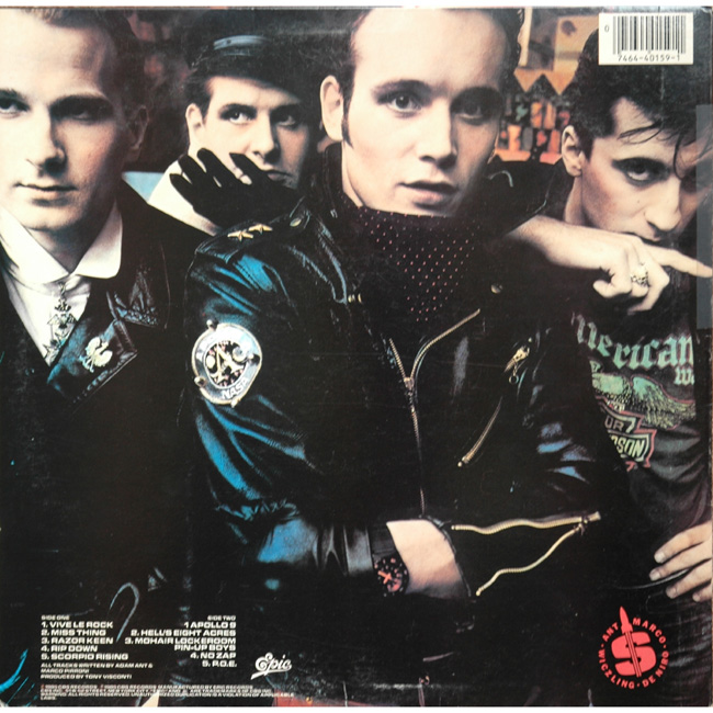 Adam Ant - vocals and piano The US lyric bag was printed on gloss paper and all in black and white. The album credits the track Apollo 9 - Accapella on the label the same as the US release. |