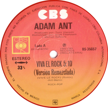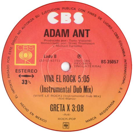 Adam Ant Country Label Catalogue Number Matrix numbers Format Release date A-side B-side Mexican red vinyl 12" pressing. The B-side, Greta X, is an old Adam Ant song from 1978. |