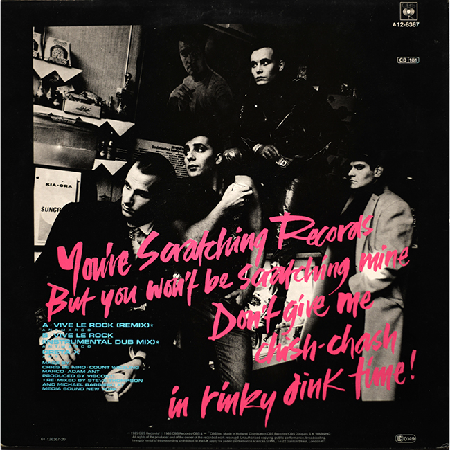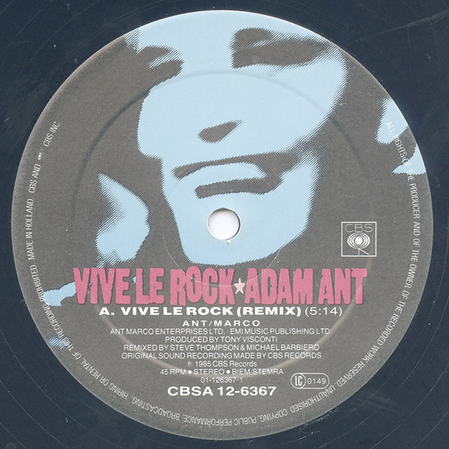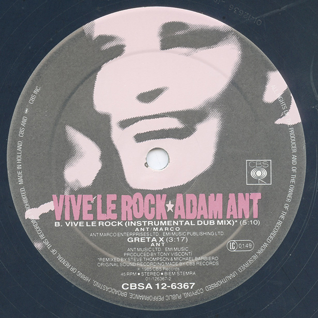 Adam Ant Country Label Catalogue Number Matrix numbers Format Release date A-side B-side This 12" plays at 45RPM The third track, Greta X is an old Adam Ant song from 1978. This 12" vinyl was manufactured in the Netherlands but was for a wider European release and distribution. |