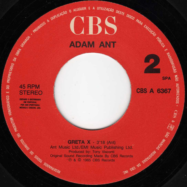 Adam Ant Country Label Catalogue Number Matrix numbers Format Release date A-side B-side Portuguese promo pressing. The B-side, Greta X, is an old Adam Ant song from 1978. |