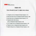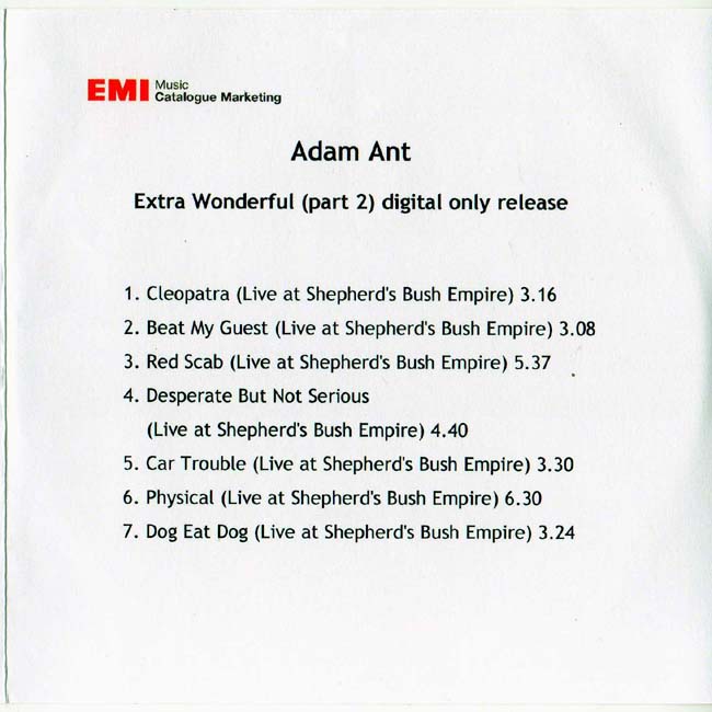 Adam Ant Country Label Catalogue Number Matrix numbers Format Release date tracklist A digital download release of all of the tracks released as singles including all of their B-Sides from the Wonderful album era. Cleopatra, Beat My Guest and Red Scab were originally released as the live tracks with CD1 for the Gotta Be a Sin single. In March 1995 Adam played for 3 sold out nights in London at Shepherds Bush Empire. The live tracks featured here and on the Gotta Be a Sin single were taken from two of those nights as follows: Although a digital download only release; promo CD copies were sent out for review purposes. |