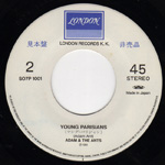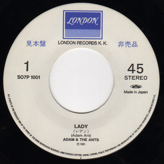 Adam and the Ants Country Label Catalogue Number Matrix numbers Format Release date A-side B-side Released in Japan after the worldwide success of Adam and the Ants. London Records was a label headquartered in the UK which marketed records around the world. Originally formed due to a split in ownership between the British and American branches of Decca, the company became a semi independent label in 1979 (the KK after the label name stands for kabushiki kaisha which is the Japanese abbreviation for Co Ltd.) The Japanese release differed mainly from all other releases as it had Lady as the A side and Young Parisians as the B side. The cover featured a photograph of Adam and Matthew taken at London, Camden, Music Machine 1st November 1978 and also had the lyrics transcribed on the reverse of the sleeve which included such errors as “They love Patty cement” rather than Patti Smith. This white label promotional copy has the following symbols on the record label to identify them from the standard release: |